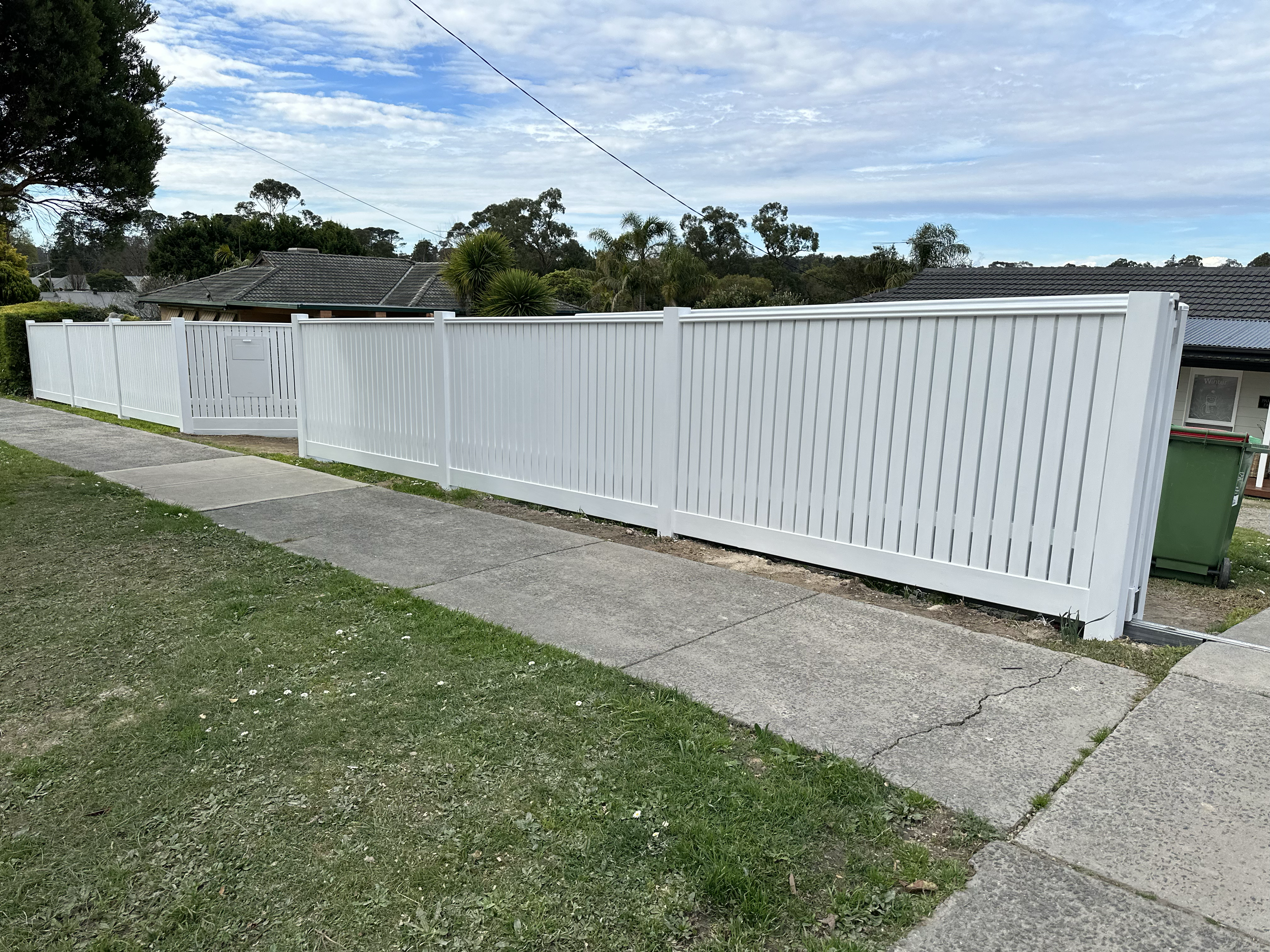 White vinyl fence along a sidewalk, with a grassy area in the foreground and residential houses with trees in the background under a partly cloudy sky.