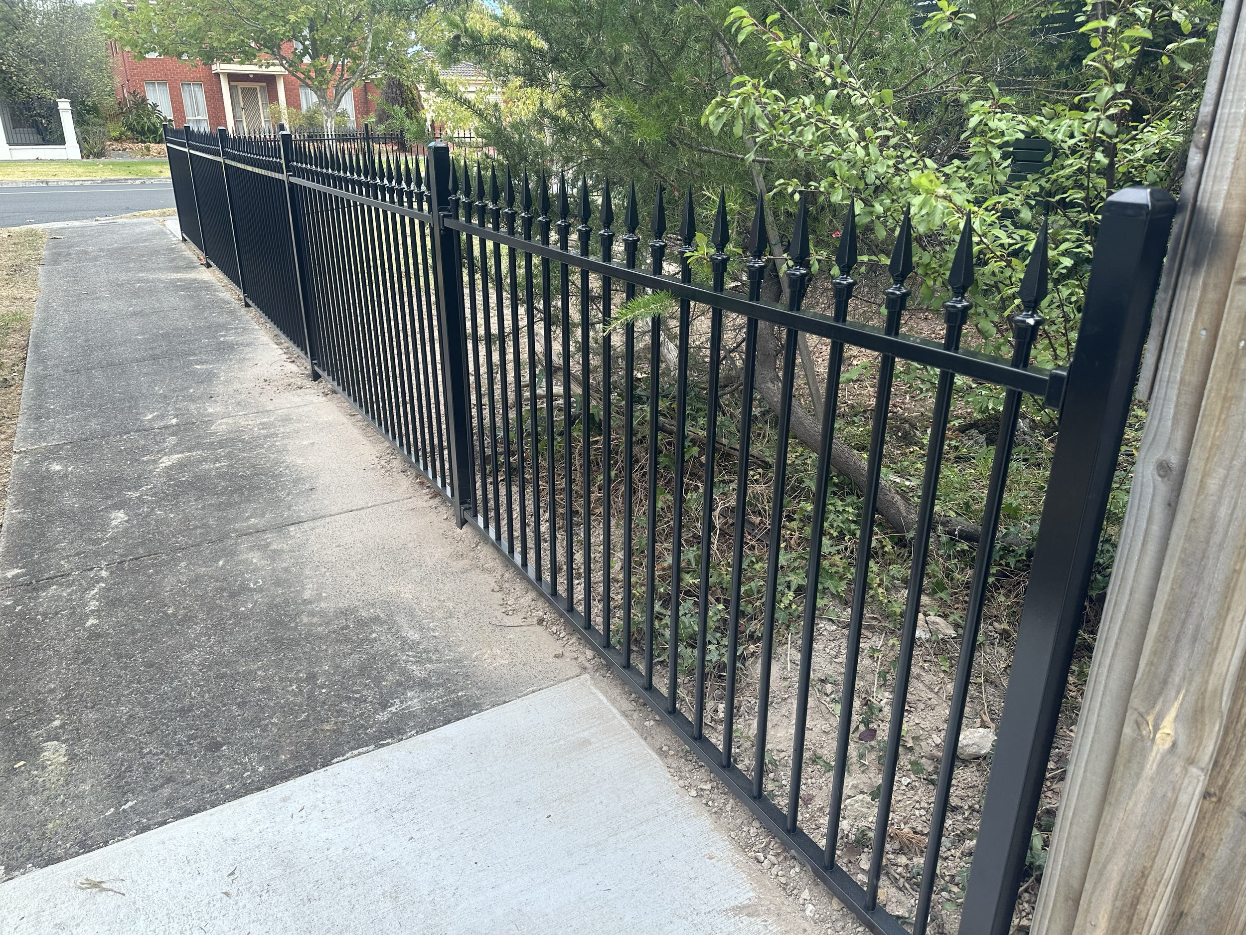 A black metal fence with pointed tips along a sidewalk, separating a yard with trees and bushes from the street.