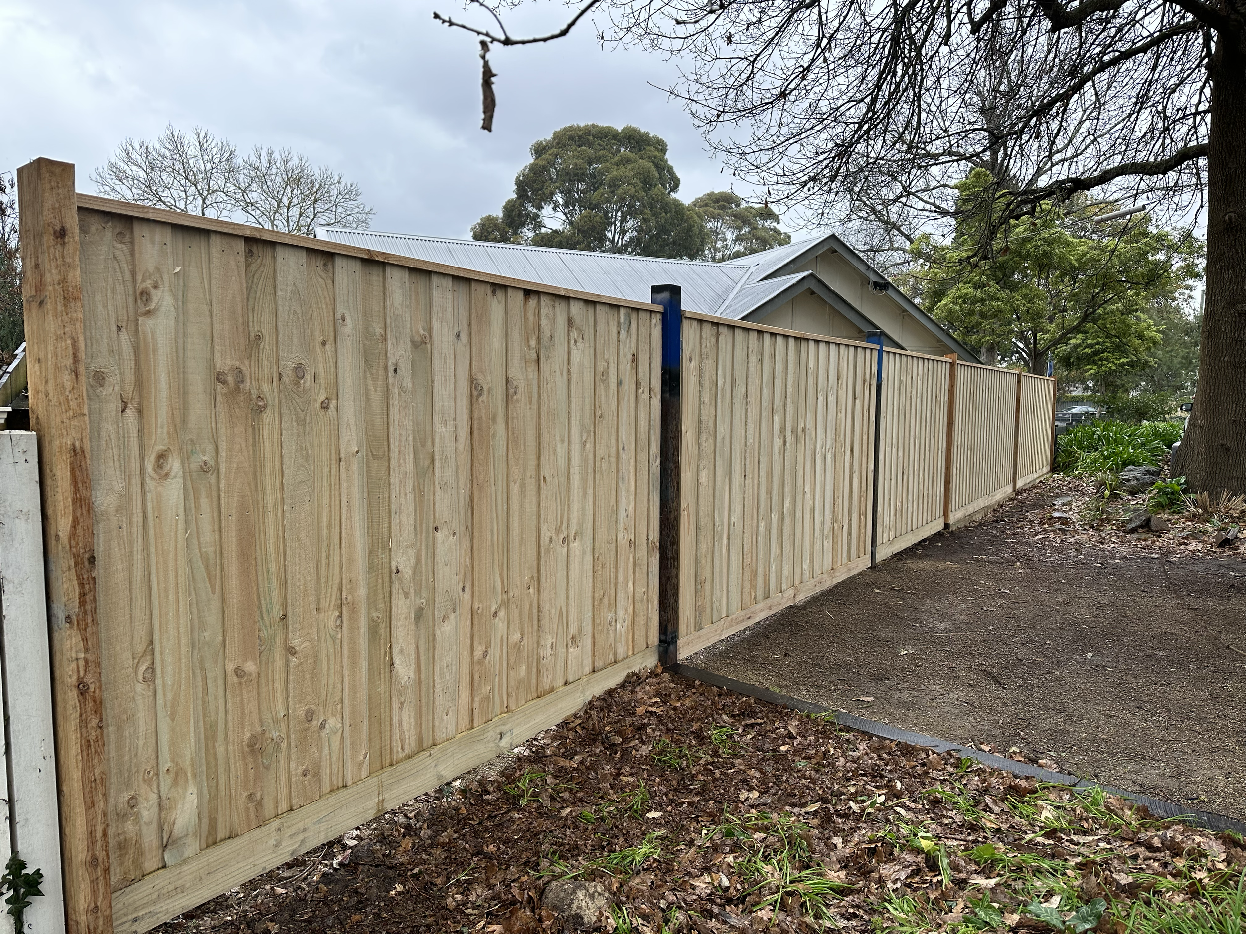New wooden fence along a backyard with a house in the background, trees, and a cloudy sky.