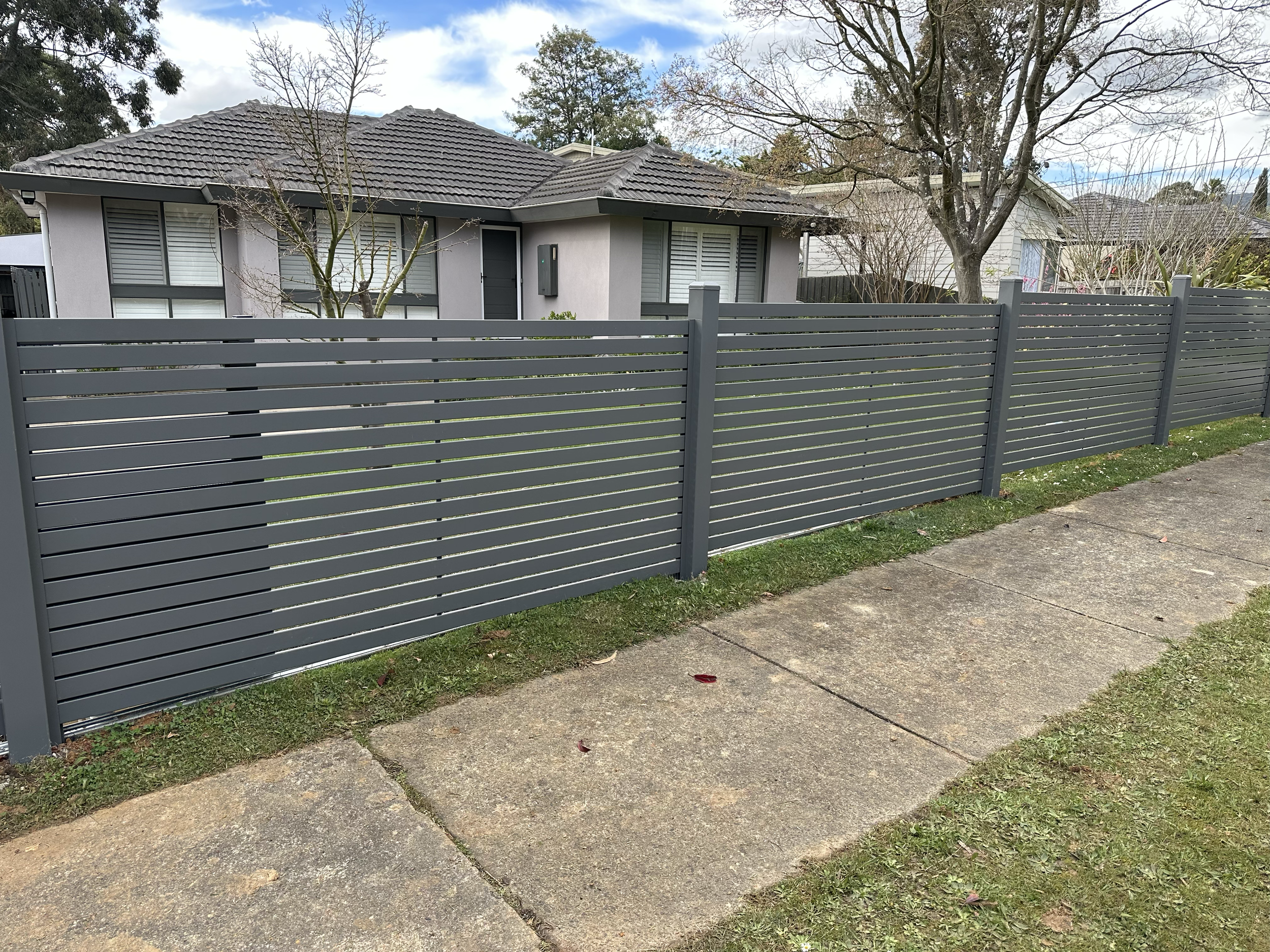Gray horizontal slat fence along sidewalk in front of a single-story house with gray roof and white window shutters.