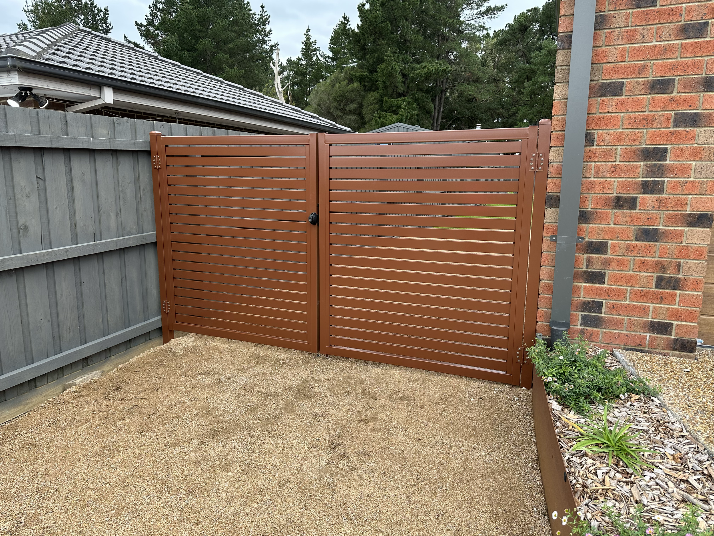 A brown metal gate with horizontal slats, situated next to a brick house wall and a gray wooden fence, with a small garden bed containing greenery and flowers.