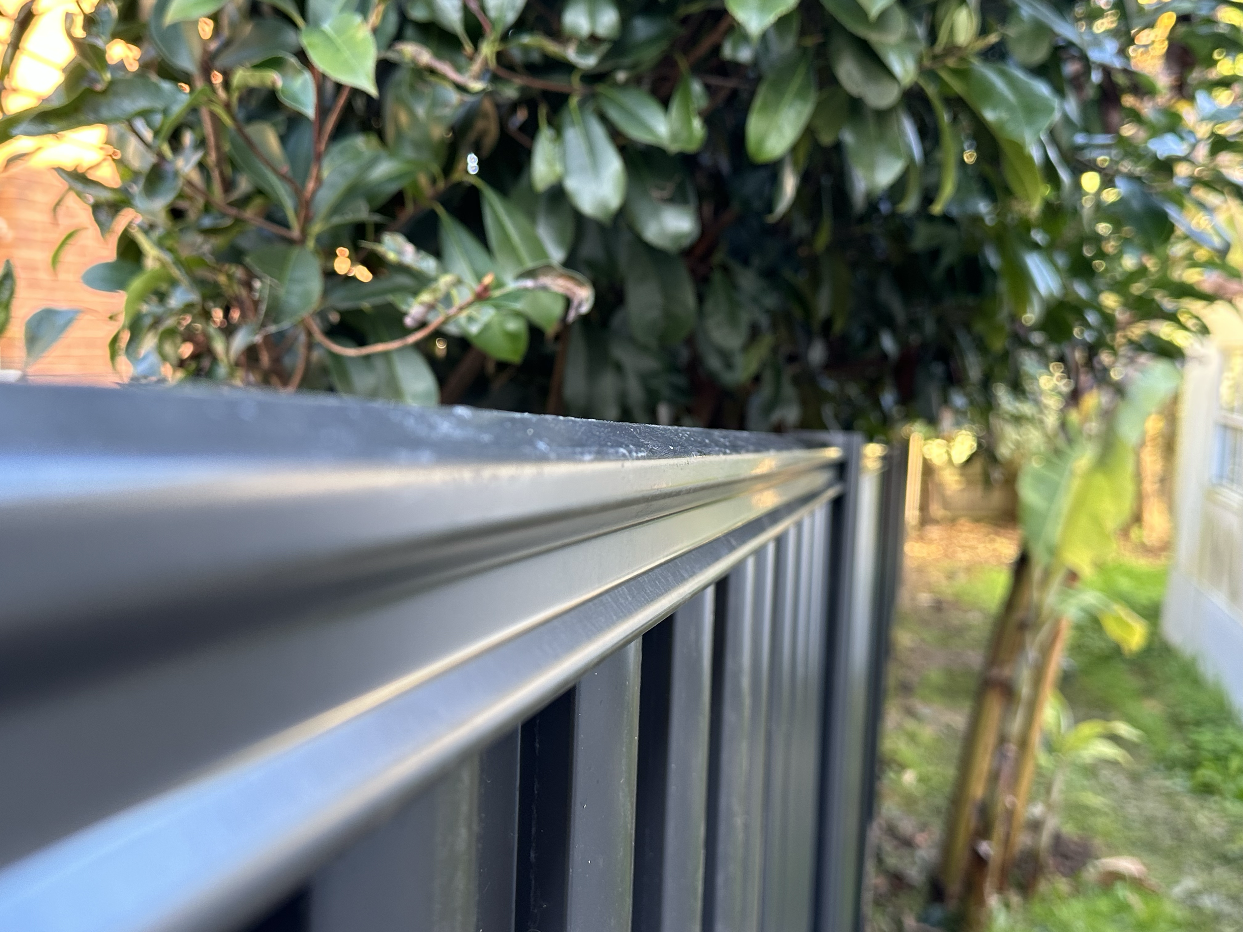 A long, black metal fence along a gravel walkway in a residential area with trees and greenery in the background.